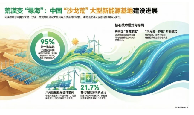 戈壁、沙漠和荒漠("沙戈荒")是中国推进大型新能源基地建设的核心战场。据国家能源局2025年1月披露:第一批"沙戈荒"大型风电光伏基地规划总规模约1亿千瓦,截至2024年底已建成并网91.99GW(约9199万千瓦),投产规模达90.79GW,建成比例达95%。