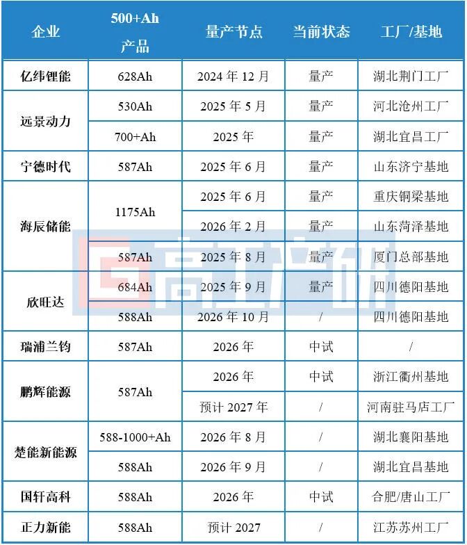 500Ah+电芯的量产已成为划分电芯企业梯队的技术分水岭,落后者面临出局风险。同时倒逼以集成、BMS、温控、消防为主的产业链升级与重构。