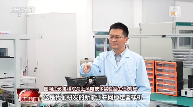 国网江苏电科院海上风电技术实验室主任 刘建:这是我们研发的新能源并网稳定器样机,就像给转速波动的风机装上“稳压器”,让输出的电平稳可靠。