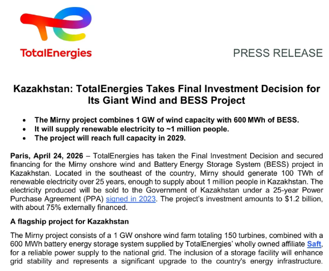 2026年4月24日法国能源巨头道达尔能源正式宣布,为哈萨克斯坦米尔内陆上风电与电池储能项目做出最终投资决定(FID)。这不是一个寻常的商业公告,而是一场横跨欧亚大陆、链接六国资本的能源远征的正式启动。