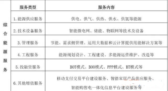 按照服务类型划分,综合能源服务大致可以分为6类:能源供应服务、技术设备服务、管理服务、工程服务、投融资服务、其他衍生服务,具体见表1。