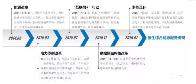 2014年6月13日,中央财经领导小组第6次会议明确提出了我国能源安全发展的“四个革命”战略思想,即:推动能源消费革命,抑制不合理能源消费;推动能源供给革命,建立多元供应体系;推动能源技术革命,带动产业升级;推动能源体制革命,打通能源发展快车道。随后电力体制改革9号文出台,按照“管住中间,放开两头”的原则,提出“三放开、一独立”政策,而供给侧结构性改革着力在去产能方面发力,特别是煤炭去产能成为能源领域的重要内容,并以“互联网+”智慧能源这一新概念促进能源系统扁平化,加上多能互补的发展方向,这一系列政策的出台(具体见图1)有效地推动了能源供应结构向多元化发展,从而促进新业态的发展,催生新的商业模式,即综合能源服务的诞生。