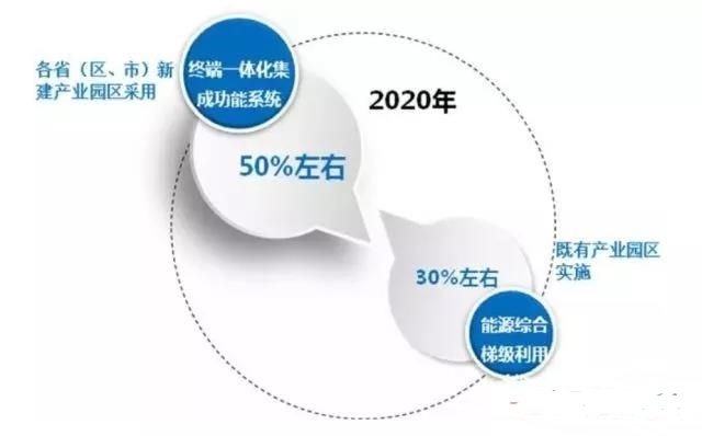 到2020年,各省(区、市)新建产业园区采用终端一体化集成供能系统的比例达到50%左右,既有产业园区实施能源综合梯级利用改造的比例达到30%左右,具体见图3。由于既有园区改造成本高,供水、供热等行业存在垄断难以介入,且改造比例相对较小,因此以新建产业园区作为重点布局。