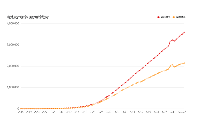 图片:海外累计确诊和现存确诊趋势图来源:凤凰新闻