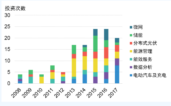 (3)通过风险投资(VC)、私募股权投资(PE)进行前瞻性布局模式。2013年以来,综合能源服务领域的风险投资、私募股权投资显著增多。其中对能源管理、储能、电动汽车及充电投资次数最多,分别占25%、17%、16%(见图3)。法国Engie集团是目前进行风险投资最多的公司,广泛投资电动汽车、储能、数据分析等领域的优质初创企业,使其能够紧密追踪技术发展并具有先发优势。