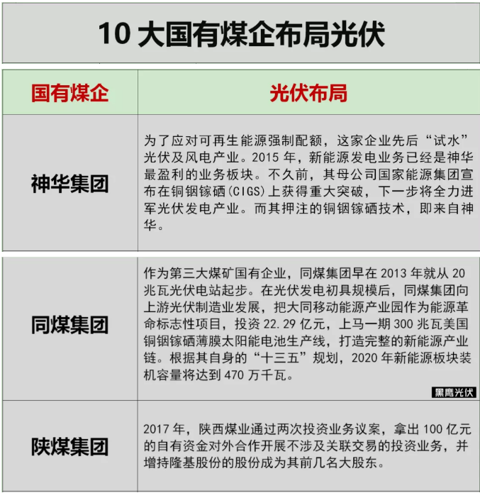 其中,包括“五大四小”在内的电力央企明显加大新能源领域的投入;包括神华集团、同煤集团、山东能源集团等在内的10大国有煤炭企业均准备在光伏领域大展拳脚。