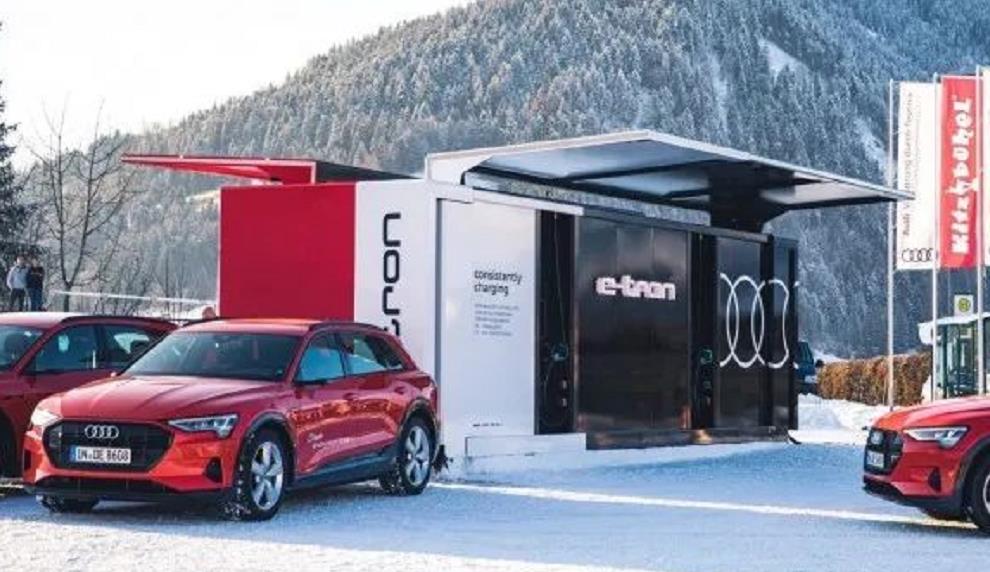 而在今年年初,在达沃斯世界经济论坛上,奥迪工作人员驾驶了一批e-tron电动SUV来运送参会嘉宾,其团队将该充电系统与水利发电电网连接,再通过集装箱充电系统给车辆充电,这样补充能源的方式,让他们的车队真正实现了零排放和碳中和。