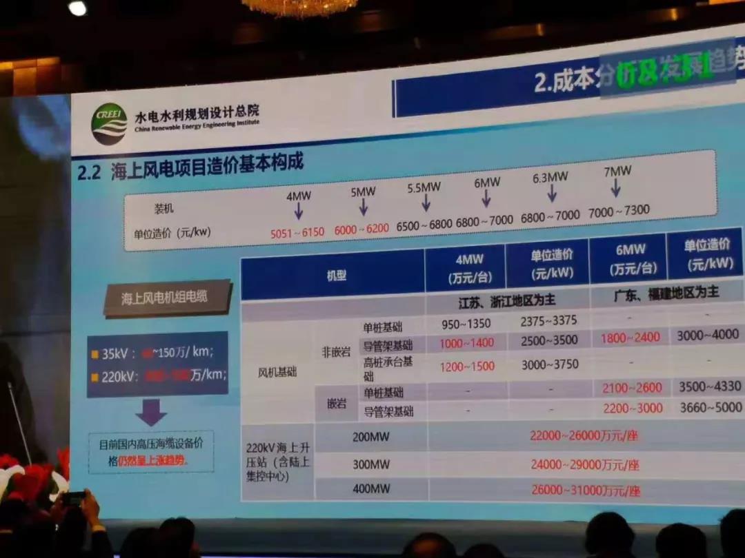 海上风电成本构成。风电机组的价格4兆瓦和5兆瓦大约在6000元左右,6兆瓦以上由于没有大批量应用,研发成本较高,相对来讲单位造价比较高一点。另外从我们的风电机组基础来看,4兆瓦单桩基础造价大约为900到1300万元,导管架基础造价大约为1000到1400万元,高桩承台基础造价大约为1200到1500万元。广东和福建由于地质条件复杂,单台基础的造价在2000万元左右。从已建的项目来看,每座海上升压站加上陆上集控中心造价在2亿元以上,海上风电海缆的价格相对来讲也比较贵,35kV的海缆造价基本上在60万到150万元每公里左右,220kV海缆造价在400万到500万元每公里左右。