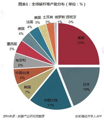 目前全球碳纤维制造的主导者是美国、日本和中国。随着中国在碳纤维领域投入的不断增大,中国碳纤维产量占世界份额也不断提高。前瞻产业研究院发布的《2018-2023年中国碳纤维行业深度调研与投资战略规划分析报告》显示,当前中国大陆碳纤维产能在全球占比达17%,中国台湾产能占全球的6%,二者之和超过日本。