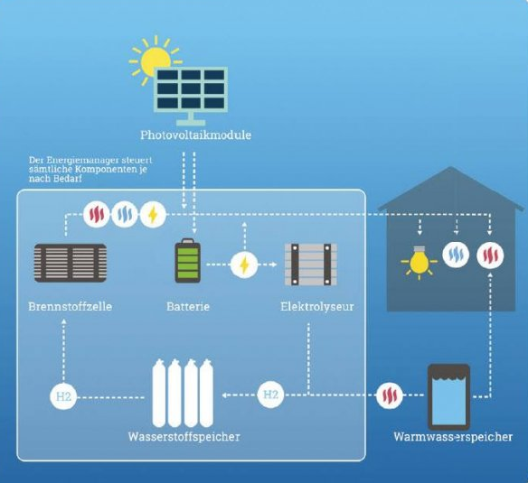 太阳能光伏装置在晴天产生的能量既可以直接使用,也可以转化为氢气储存。这些能量在晚上或者在阳光有限的冬天被利用。HPS系统的燃料电池将储存为氢气的能量转换为电能和所需的热量。