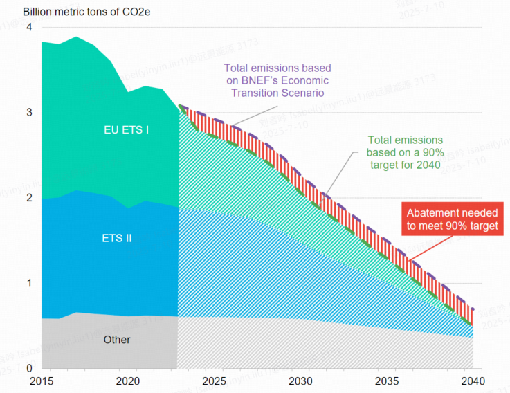 BNEF测算后认为,在欧盟的经济转型背景下,最多只能实现77%的减排,若要实现2040年减排90%的目标,仍然存在巨大的碳减排缺口。