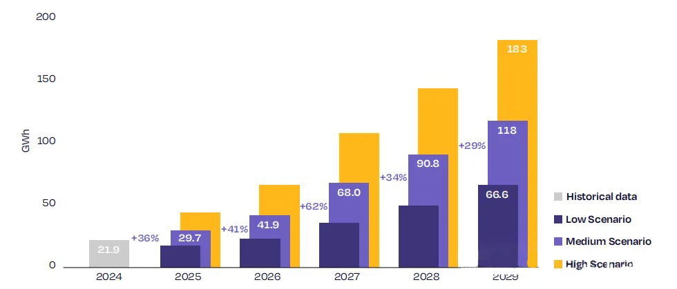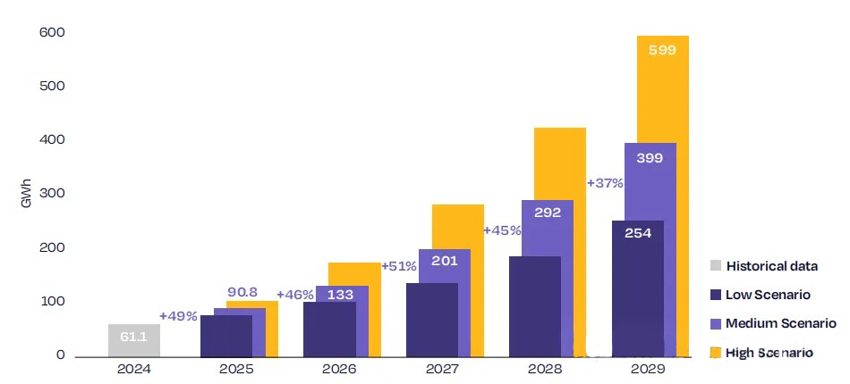 ➮ 2028-2029年增速放缓但仍强劲,分别达90.8GWh(+34%)和118GWh(+29%)