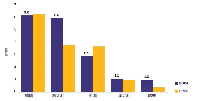 2024年,欧洲电池储能市场格局呈现显著分化。德国、意大利和英国三大传统强国继续领跑市场