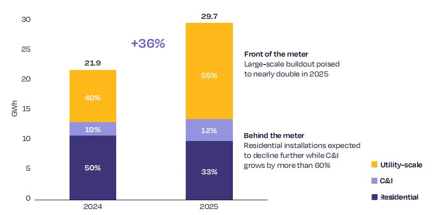 市场格局正在经历深刻变革。公用事业规模储能将引领增长,预计2025年实现近乎翻倍的扩张,这一迅猛发展将有效弥补用户侧(BTM)储能市场的整体停滞。具体来看,户用储能安装量可能延续下滑趋势,而工商业(C&I)领域虽保持增长态势,但其实际发展潜力远未得到充分释放。