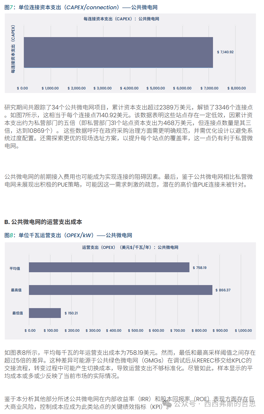 年均运营成本为 $758.19/kW。尽管平均值略低,但其数据波动性大。考虑到公共微电网资产需在不同政府机构间(如从 REREC 移交至 KPLC)进行交接,可能产生额外的转换成本和非标准化的运营流程。同时,鉴于政府预算的限制,公共项目的长期运营可持续性存在较高风险。
