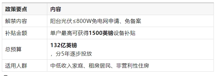 2024年3月,英国能源安全与净零部(DESNZ)**宣布正式解除对阳台光伏的并网限制,并将其纳入国家级“温暖家园计划(Warm Home Scheme)”补贴范围,重点扶持中低收入家庭和租房人群: