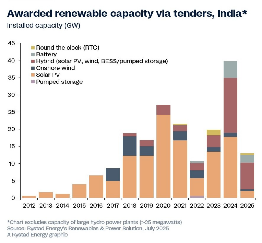 挪威能源研究机构Rystad Energy的一份新报告也称,印度在2025年上半年向开发商授予了5.4GW的托管太阳能加电池储能系统(BESS)和2.2GW的独立储能。