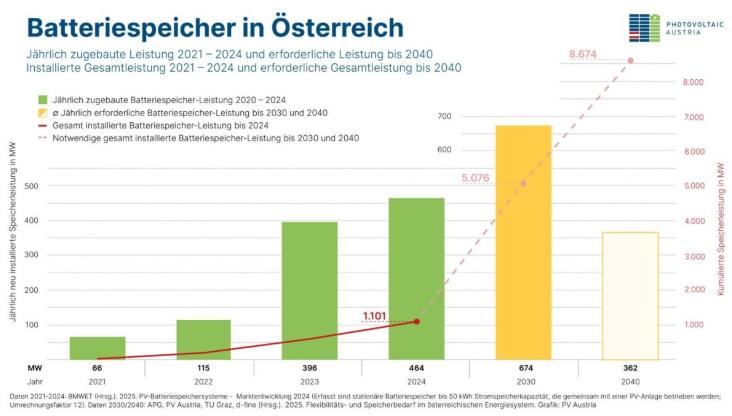 这一呼吁基于奥地利最新储能需求研究。该研究由奥地利光伏联邦协会、输电系统运营商奥地利电网、格拉茨技术大学等机构共同完成,首次详细测算了奥地利实现2030年100%可再生能源电力和2040年气候中和目标所需的储能规模。研究显示,按照当前光伏扩张目标(2030年21吉瓦,2040年41吉瓦),电池储能将成为连接发电与用电的核心环节,用于平衡光伏出力、提升系统灵活性并弥补电网容量不足。