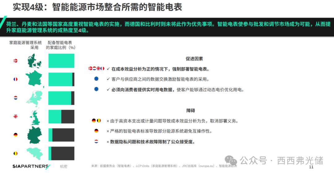 作为HEMS迈向第4级成熟度(市场整合)的必要基础设施,其普及至关重要。荷兰、法国等国通过强制推广政策取得了高普及率,而德国和比利时则相对滞后。推广的主要障碍包括成本效益分析不达标、严格的技术标准带来的兼容性问题以及公众对数据隐私的担忧。