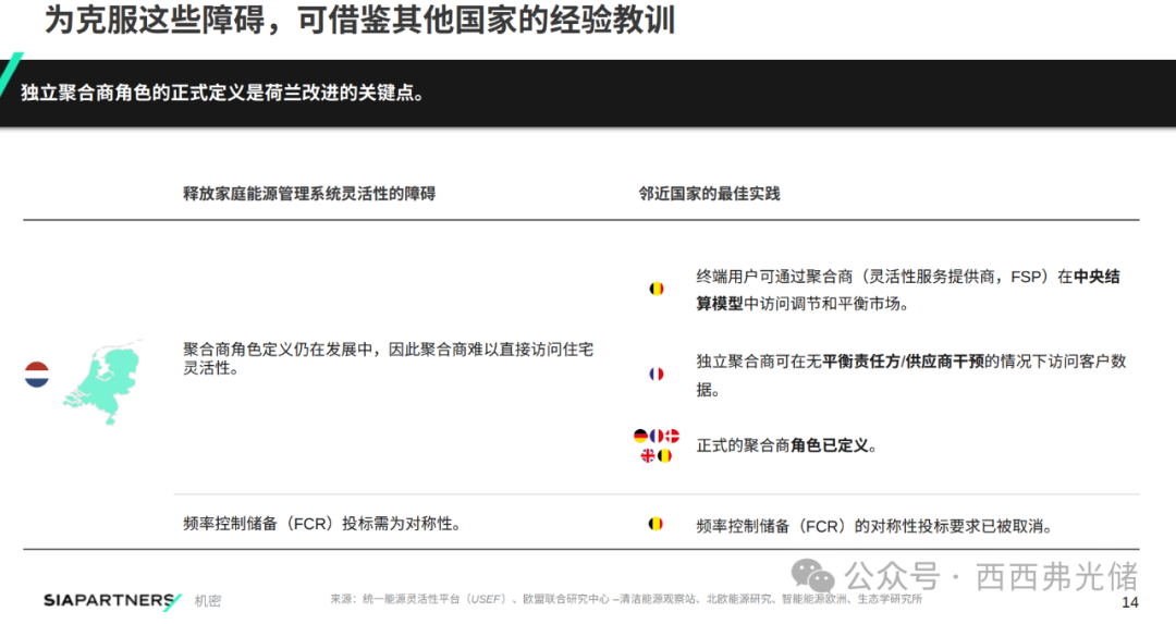 荷兰的关键挑战在于“聚合商”角色的市场定位尚不清晰。尽管市场允许用户通过BRP参与平衡市场,但独立聚合商难以直接、高效地整合住宅侧的灵活性资源,且部分市场(如频率控制储备)的对称竞价规则限制了电池等资源的参与。对此,报告建议荷兰借鉴他国经验,明确独立聚合商的法律地位和市场准入规则,并优化市场机制,如取消对称竞价要求,从而为聚合业务的创新发展扫清障碍。