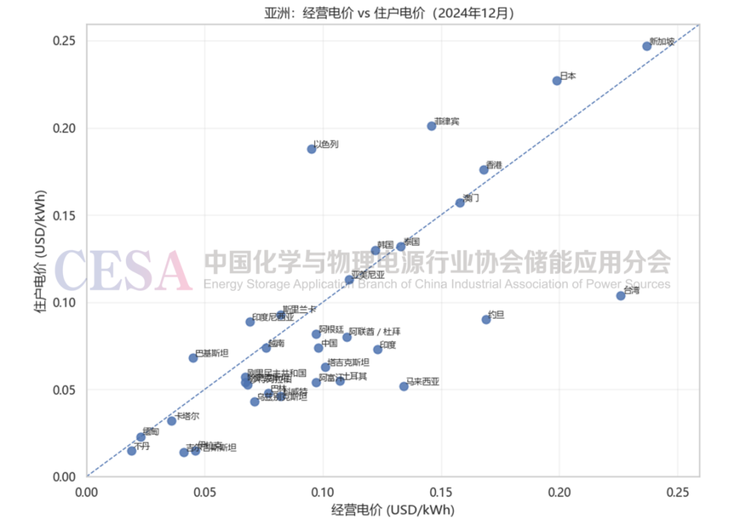 缅甸的反差则更为极端,其工商业电价(0.156美元/kWh)是全球最低的居民电价(0.023美元/kWh)的近7倍,这种惩罚性的价格体系为高耗能企业配置储能削峰填谷创造了无法回避的刚性需求。