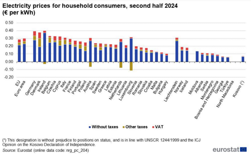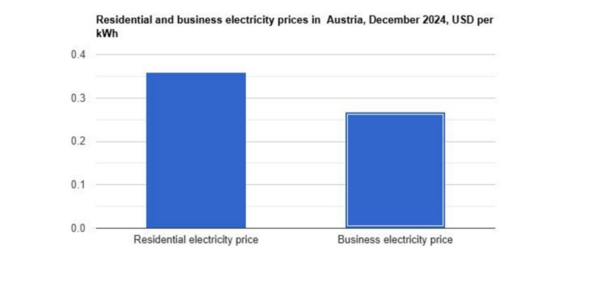 奥地利的住宅电价约为每千⽡时0.312欧元(或0.360美元,2024年12⽉数据)。中等家庭的平均电价约为每千⽡时0.2872欧元(2024年下半年数据),其中奥地利家庭消费者的电价 略高于欧盟中位水平。