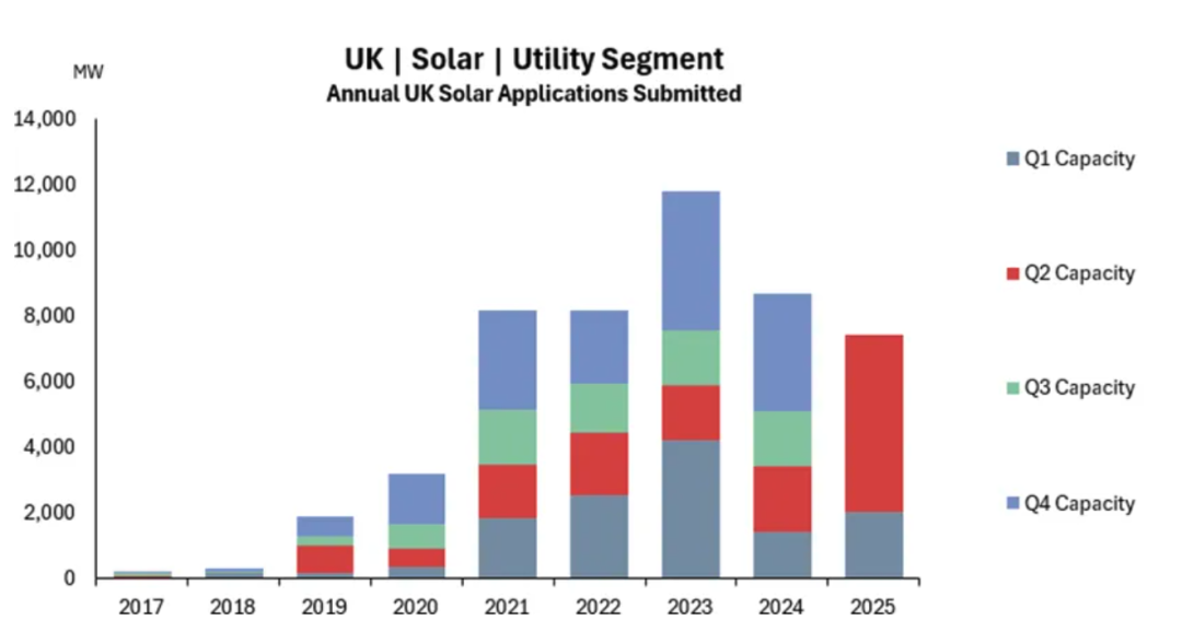 2025年英国的光伏市场开局相当猛。根据 Solar Media Market Research 2025年7月报道,上半年的新增装机容量已经超过 2GWp,差不多和 2024 全年的水平打平了,这是英国近十年来最强劲的开局。