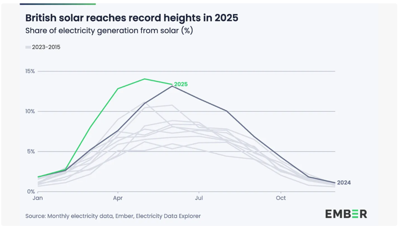 2025年初以来,太阳能发电持续打破纪录,自3月起连续五个月刷新发电峰值。7月8日更创下英国电网瞬时太阳能供电最高纪录——全国同时段供应14GW太阳能电力,较过去五年年度峰值提升44%。