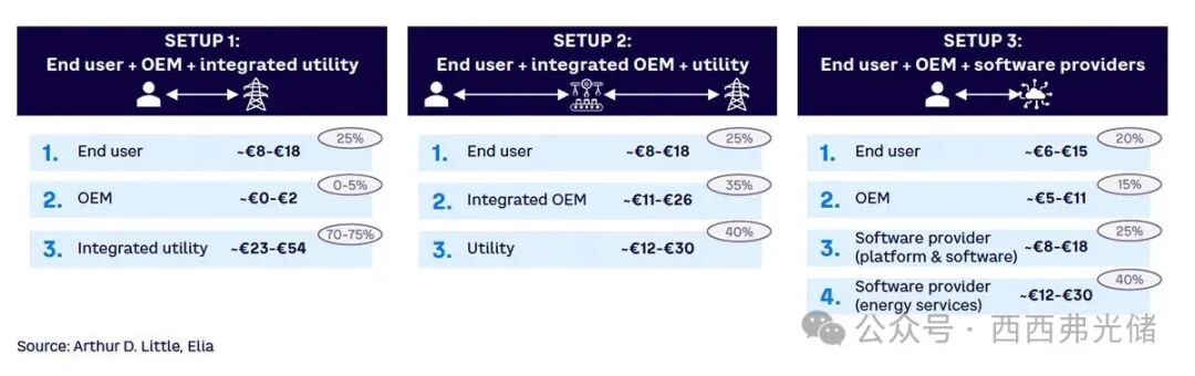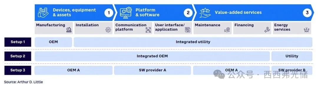 OEM 的角色仅限于硬件生产、安装和与资产相关的服务(例如,租赁、保修或保险、审计和维修,可能通过“无忧套餐”提供)。平台、软件和能源服务由不同的专业提供商提供。致力于在住宅领域打造欧洲最大虚拟电厂的初创公司 Flexa,实际上是德国顶级可再生能源系统集成商 Enpal 和能源领域人工智能创新者 Entrix 的合资企业(JV)。Enpal 负责管理监控和聚合分布式能源(DERs)(如住宅太阳能系统和电池)所需的平台和软件,而 Entrix 则专注于能源交易和优化电网互动,以将 Enpal 的 DERs 所产生的灵活性商业化。