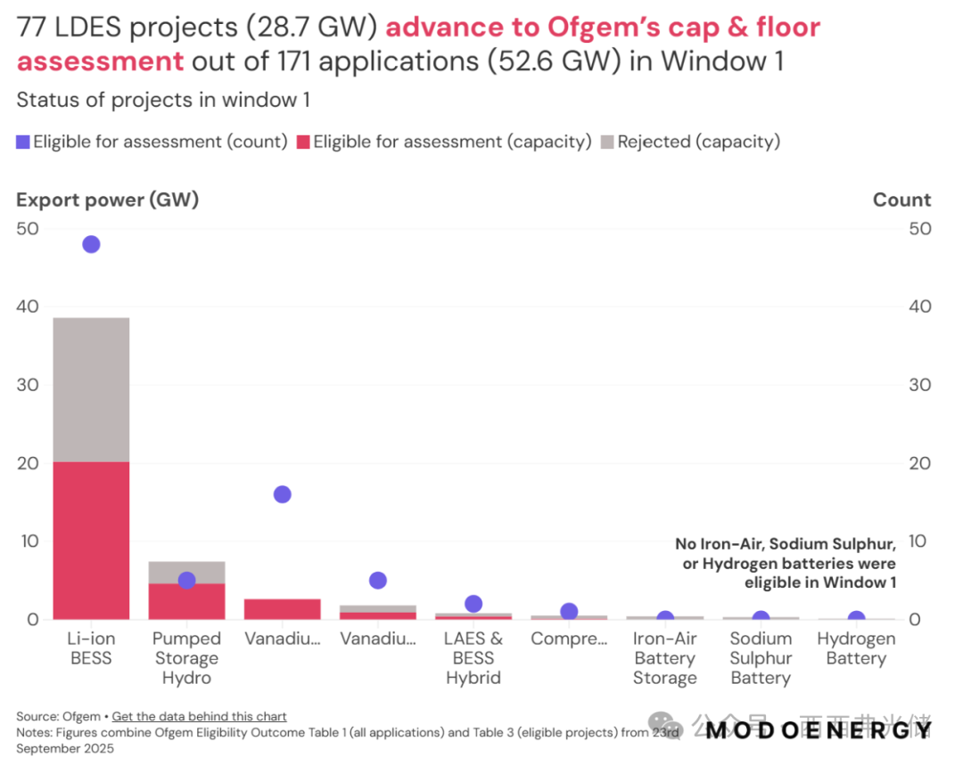 在最初申请的171个长时储能项目(总容量52.6GW)中,最终有77个项目(总容量28.7GW)通过了资格审查,即将面临多标准评估(MCA)。