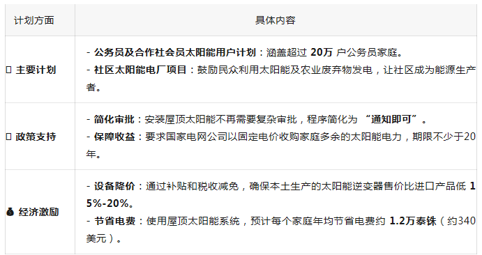 推动本土制造:为了降低设备成本,泰国政府正大力支持本土太阳能设备的生产。例如,已批准批量生产一款本土研发的5000瓦太阳能逆变器,并计划建立多个区域性组装中心,目标是形成年产50万台的能力。