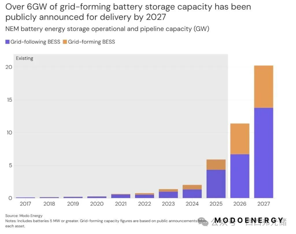 目前,市场激励正从政府补贴转向商业性的电网支持合同。截至2027年,澳大利亚已公开宣布的GFM电池储能装机容量已超过 6GW,表明GFM技术正从试点项目快速迈向主流商业化应用。系统强度节点的价格和需求已成为指导开发者在何处部署GFM储能最有价值的关键市场信号。