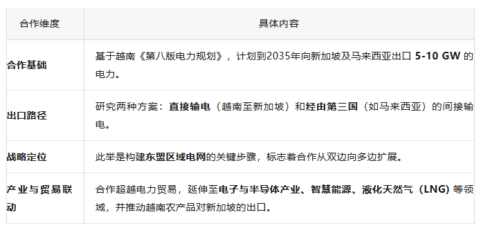 越南与新加坡近期在能源领域的合作,特别是电网互联和可再生能源出口计划,是东南亚区域能源转型中的一个重要进展。我为你梳理了此次合作的关键信息与深层意义。下表概述了越南-新加坡能源合作的核心内容: