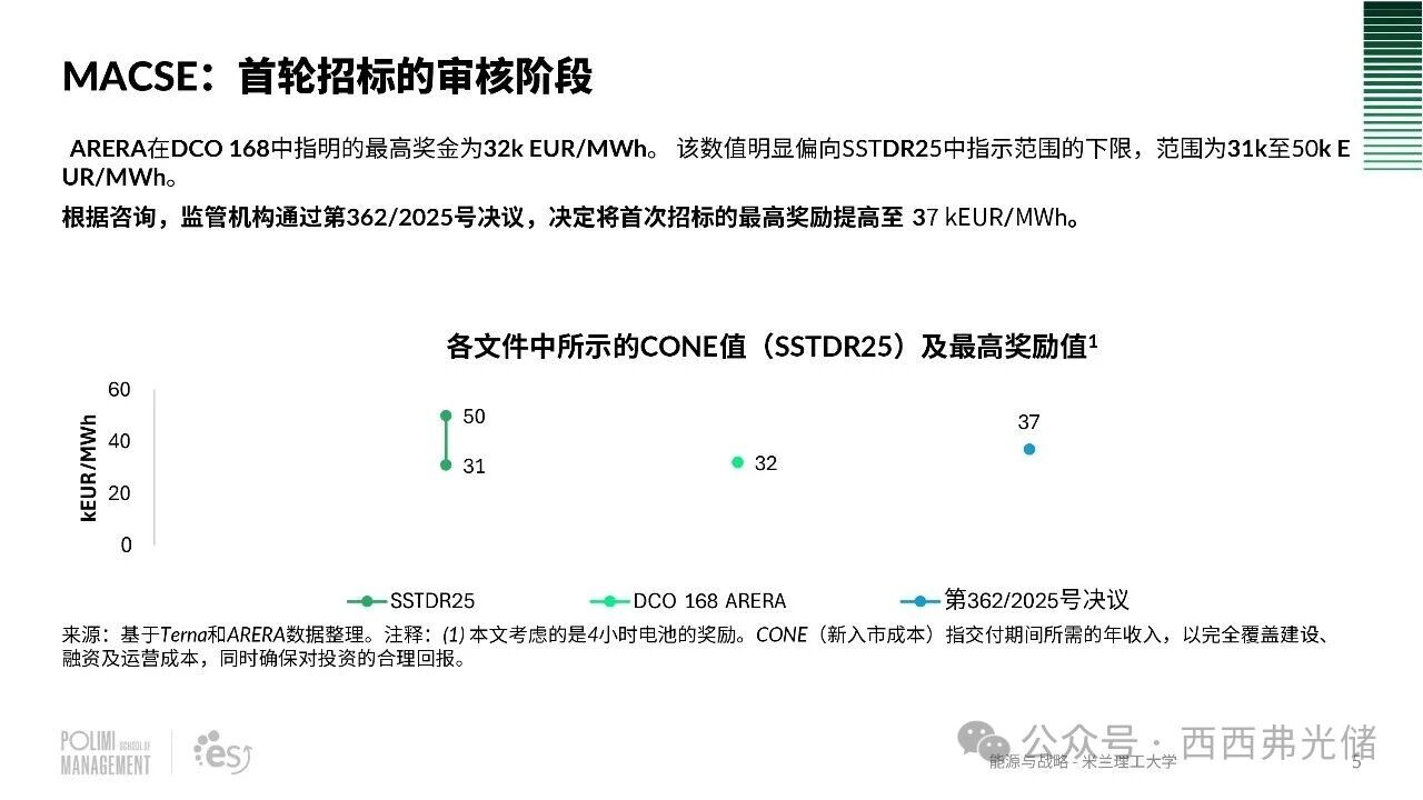中标价格尽管ARERA(意大利能源网络与环境监管局)设定的最高溢价为37 kEUR/MWh,但激烈的竞争导致最终的加权平均中标溢价仅为12.9 kEUR/MWh/年,比最高限价低65%。