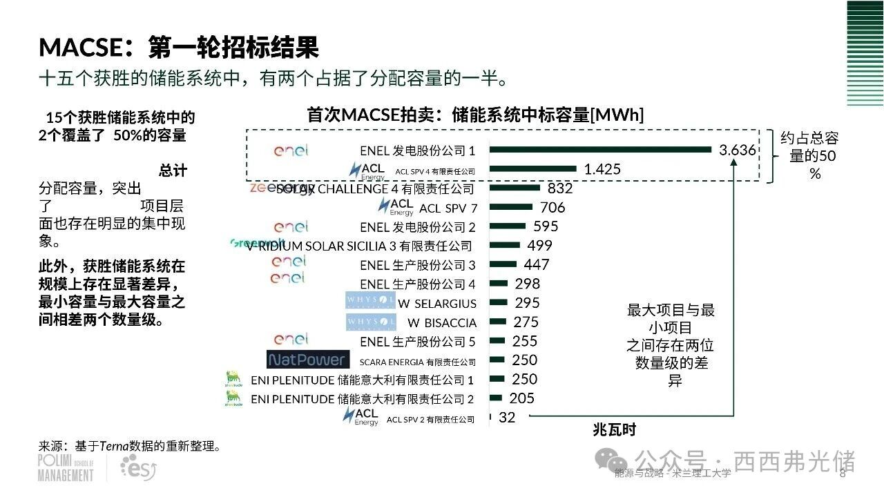市场集中度(项目)在15个中标项目中,仅2个项目就占据了总容量的约50%。这2个项目分别是 ENEL PRODUZIONE S.P.A. 1 (3,636 MWh) 和 ACL SPV 4 SRL (1,425 MWh)。