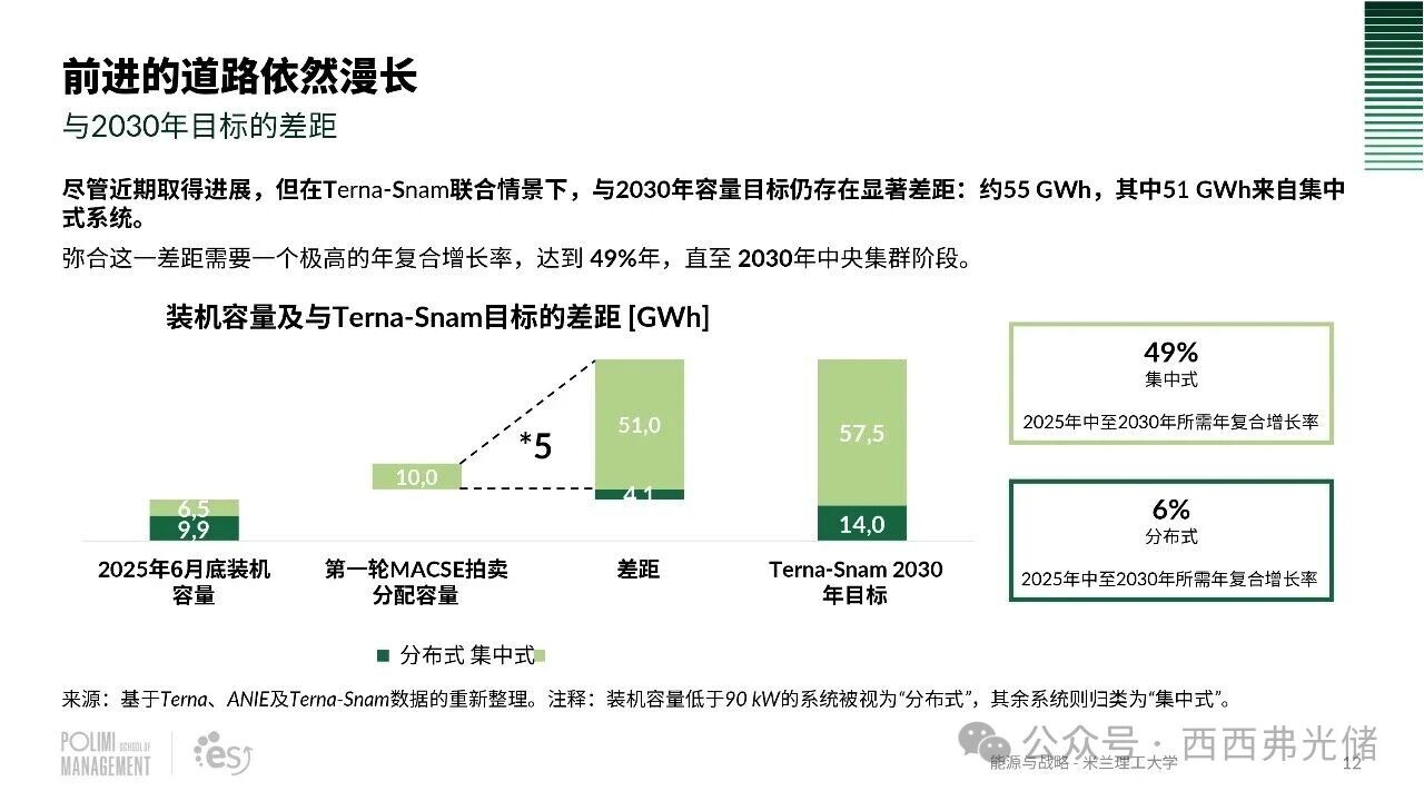 未来目标与差距尽管取得了进展,但与Terna-Snam联合设定的2030年目标 55GWh(集中式储能51 GWh)相比,仍存在巨大差距。