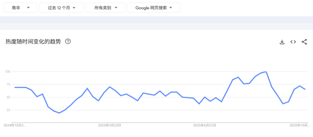 谷歌趋势数据显示,南非在过去12个月内,“solar energy”一词搜索热度在50—100之间,尤其是从7月开始,该词搜索热度飙升。全球范围来看,非洲的南非、尼日利亚等地区关注度非常高。