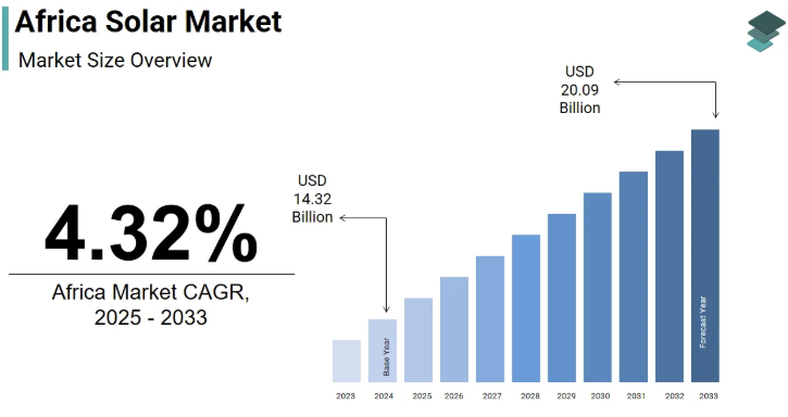 Market Data Forecast数据显示,2024年非洲太阳能市场价值为137.3亿美元,预计以4.32%年复合增长率到2033年将达到200.9亿美元。