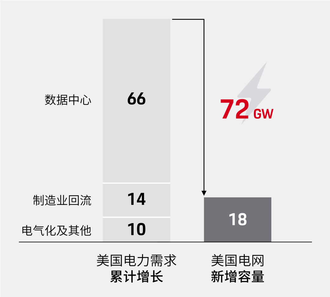 但电网供电能力的建设跟不上算力需求的增长速度。传统电网建设周期通常长达十年以上,保时捷咨询分析显示,即便在建项目全部如期落地,2026至2030五年间,美国电网传输能力的总提升仍不足20GW,难以匹配同期AI数据中心约66GW的新增需求;而制造业回流和电气化趋势雪上加霜,形成高达72GW的电网供电缺口。