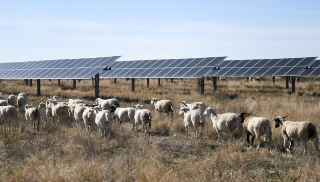 2024年12月2日,美国得克萨斯州哈斯克尔,绵羊在太阳能电池板附近放牧。