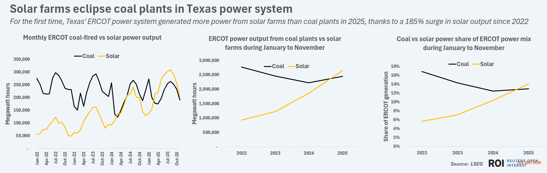 根据美国电力公司(LSEG)汇编的数据,德克萨斯州电力可靠性委员会(ERCOT)从太阳能资产中发电,发电时间为264万兆瓦时(MWh),而1月至11月期间,燃煤电厂的发电量为244万兆瓦时。