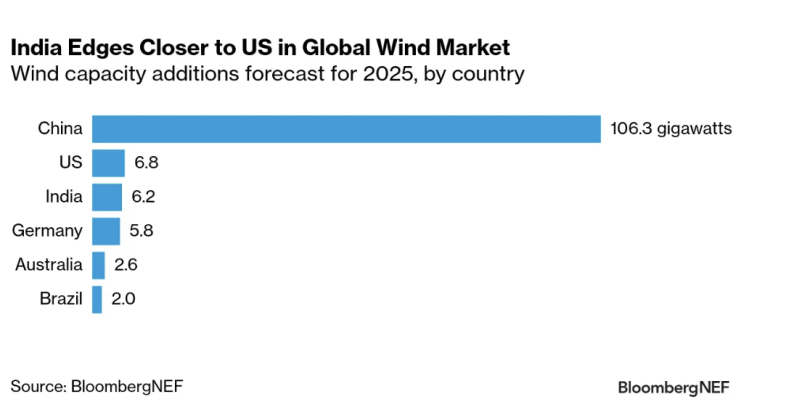 彭博新能源财经预测显示,印度风电行业在2025年重新夺回全球第三的位置,仅次于中国和美国。今年印度预计新增创纪录的6.2吉瓦风电项目,几乎是2024年总量的两倍,使印度正逼近美国的装机规模。这标志着印度风电业迎来了五年中最强劲的增长年份。