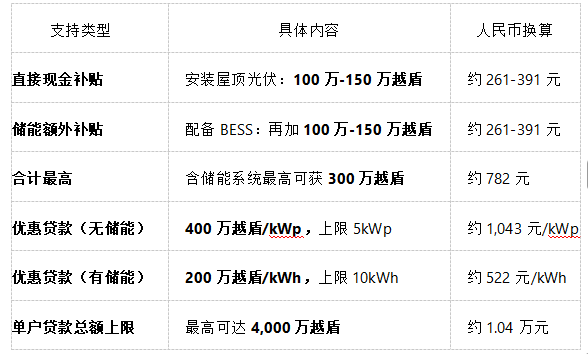 需要说明的是,直接补贴金额相对于系统总投资(5kWp系统约6,500万-8,500万越盾,即约1.7万-2.2万元人民币)虽不算大,但叠加优惠贷款后,对普通家庭的经济可行性有明显提升。