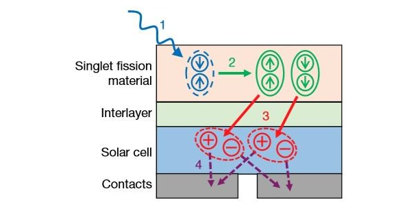 在这种情况下,他们实验了一个叫做单线态激子裂变的过程,这就是光的能量如何分裂成两个独立移动的能量包。“激发态”材料首先吸收光子,形成激子,然后激子迅速经历裂变成两个激发态,每个激发态具有原始状态的一半能量。但是新的问题又产生了,就是如何将两个能量耦合到硅中,而硅是一种非激子的材料。