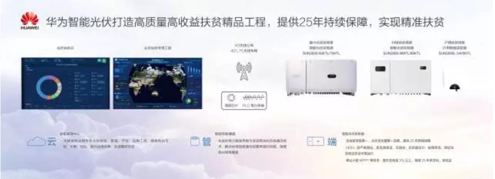 光伏扶贫是国家确定实施的“十大精准扶贫工程”之一。华为通过打造高质量、高可靠、高收益的光伏扶贫精品工程,并提供扶贫专用的验收、管理、评估和维护工具,实现光伏扶贫的“可视、可管、可控”,扶贫收益精准到户,在光伏扶贫中发挥了先进典型示范导向作用,成功的助力各贫困县实现精准扶贫,保障了农户的长期收益。这两年累计采用华为智能光伏解决方案的扶贫项目达2GW以上,包括吉林、云南、安徽、河北、陕西、山西、宁夏、山东、江西、甘肃、湖北等多个省市,覆盖了集中式扶贫、村级扶贫和户用扶贫等多种扶贫场景。在10.10国务院扶贫办召开 “2017扶贫日县域发展与脱贫攻坚论坛”,华为作为仅有的两家光伏企业代表之一,分享了智能光伏扶贫经验,受到了与会各省市区县的代表的高度认可和赞许。