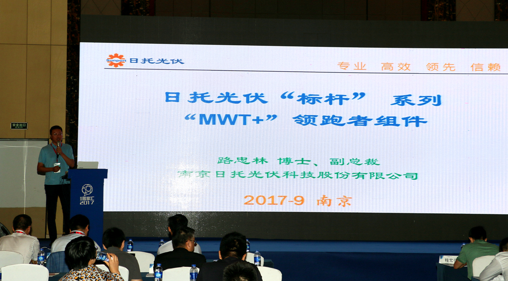 日托光伏副总裁路忠林博士在第2天大会上做了题为“日托光伏“标杆” 系列“MWT+” 领跑者组件”的演讲。他详细介绍了MWT背接触组件的工艺特点和优越性,分享了日托光伏“MWT+”技术路线。日托光伏即将于2018年1季度建成最新的400MW电池生产线,届时日托光伏60片单晶MWT+PERC的组件将达到320W,满足 “超跑者”的各项指标。