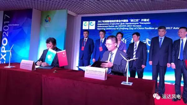 开幕式上,运达风电与哈萨克斯坦萨尔风电公司在阿斯塔纳世博会浙江日举行战略合作协议签约仪式,哈萨克斯坦Shar wind turbines LLP项目公司总经理库那分?托卡塔博拉特及运达风电副总经理斯建龙出席,哈方能源部部长马克沃夫·马拉杜勒与浙江省副省长梁黎明、中国驻哈萨克斯坦大使张汉晖见证了双方合作的签订。