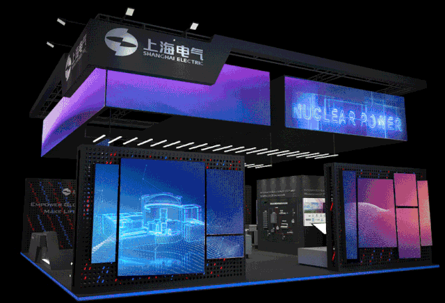 核电打破传统展示方式,运用触屏技术与观众互动,生动地展示了上海电气的核电板块的综合实力。在核电领域,上海电气已成功实现了二代加、三代AP1000、EPR、华龙一号及四代高温气冷堆核电主设备产品的批量化、配套化交付。
