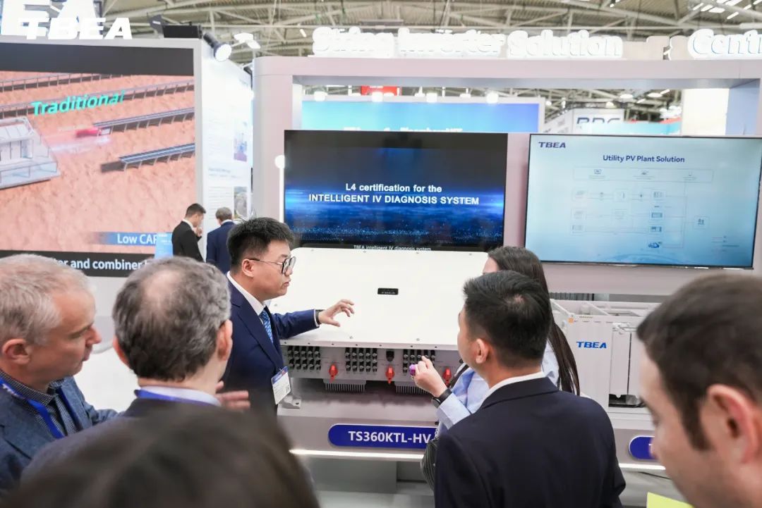 首次展出的智能汇流箱产品支持8-24路直流输入,与集中式逆变升压一体机共同为客户提供灵活的集中式解决方案,采用PLC通讯技术,可有效节省项目通讯线缆成本,最高可选IP66防护等级,直流拉弧分断(AFCI)时间≤40ms,支持L4级别IV扫描和故障诊断,显著提升运维效率,助力客户实现智能化运维。