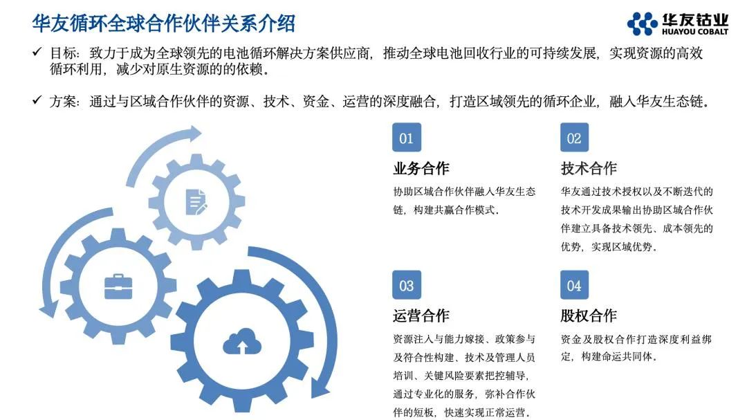 华友循环将在全球范围内,与合作伙伴共建多样化合作模式,如业务合作、技术合作、运营合作、股权合作等,不断深化全球资源协同与技术共享,推动行业标准提升与可持续生态建设: